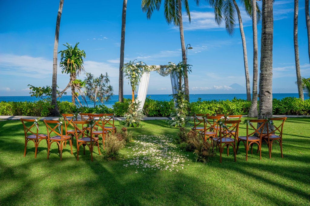 Overlooking the pristine Mangsit Beach and facing the majestic Mount Agung, it blends tropical serenity with modern luxury. The resort’s all-glass Wedding Pavilion sits on a cliff, offering breathtaking views for your vows—whether it’s under the soft morning light, golden sunset, or starlit sky. This venue is perfect for couples seeking a romantic, intimate, and scenic setting to say “I do.”